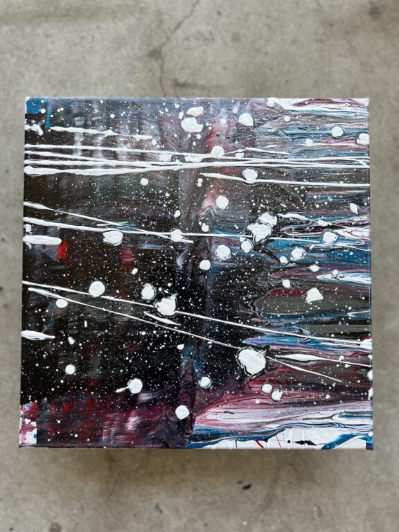 In the beginning, Gogerty experimented with making his splatter paintings on printer paper, but after bringing some of his work to school and seeing the great feedback he was getting, he moved on to canvases. His process for making each design can vary and includes a mix of techniques like pouring, spraying, and splattering paint to build a one-of-a-kind composition. It takes Gogerty around 20 minutes to 1 hour to complete a painting, which he then finishes with an application of a sealer.
