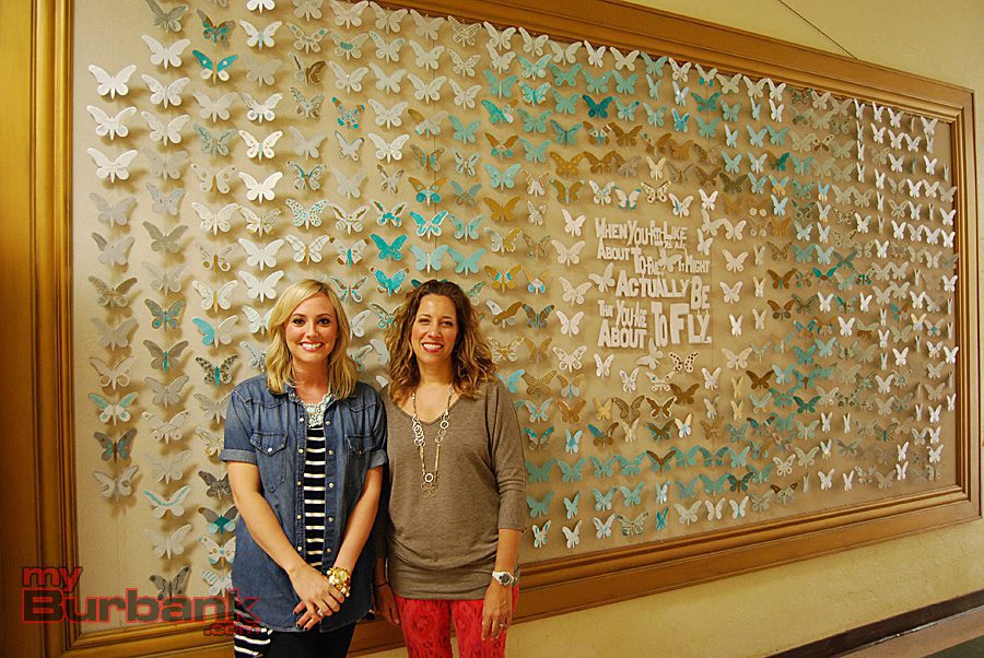 Shauna Funk (left) and Kristen Gara coordinated and installed the giant art project, comprised of hundreds of individual butterflies, in the main hallway of Roosevelt Elementary School. (Photo By Lisa Paredes)