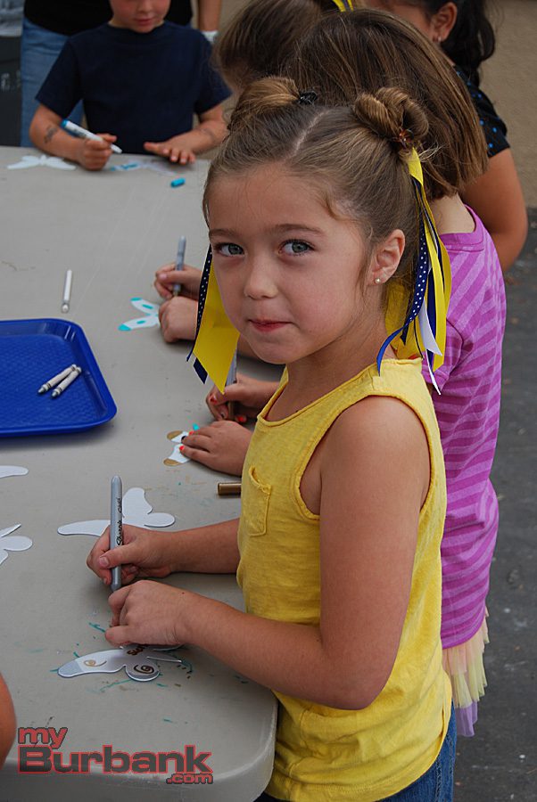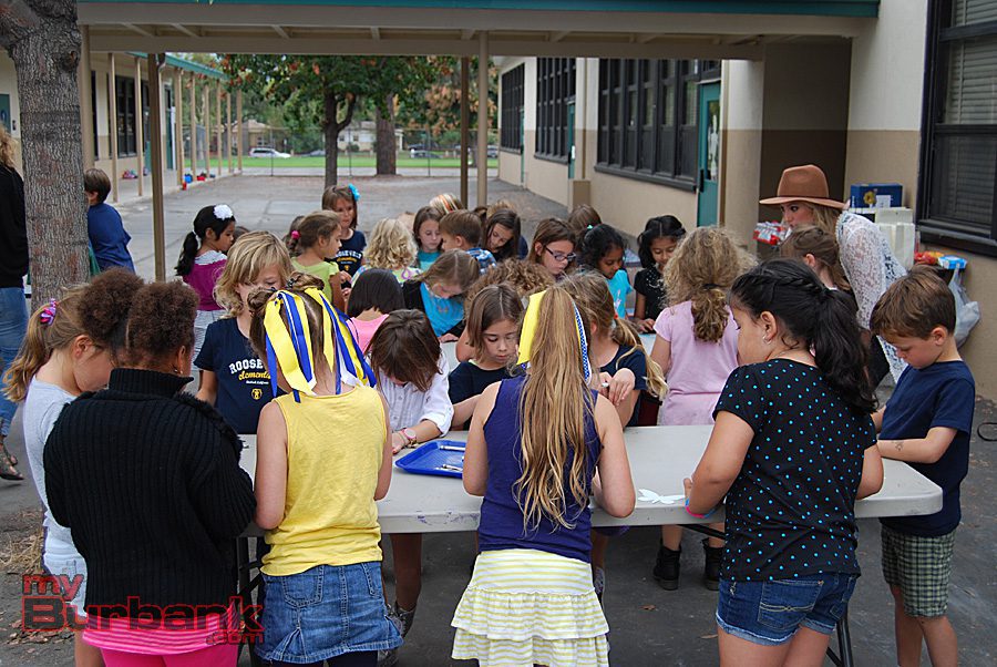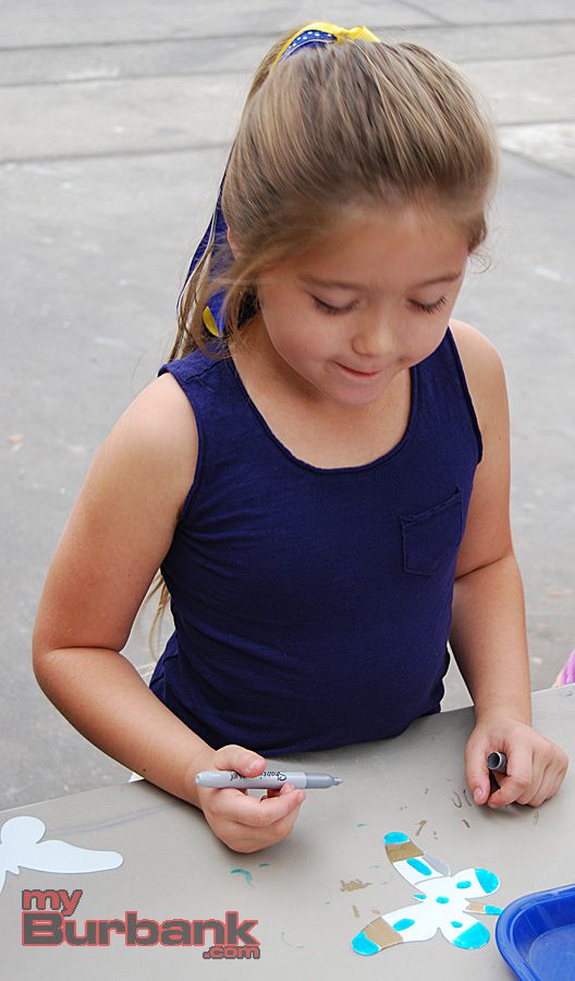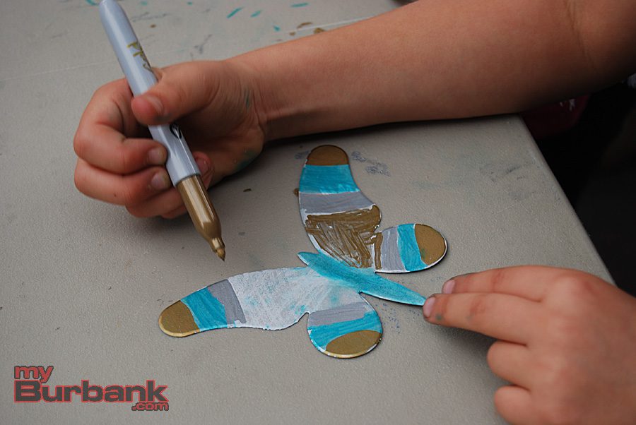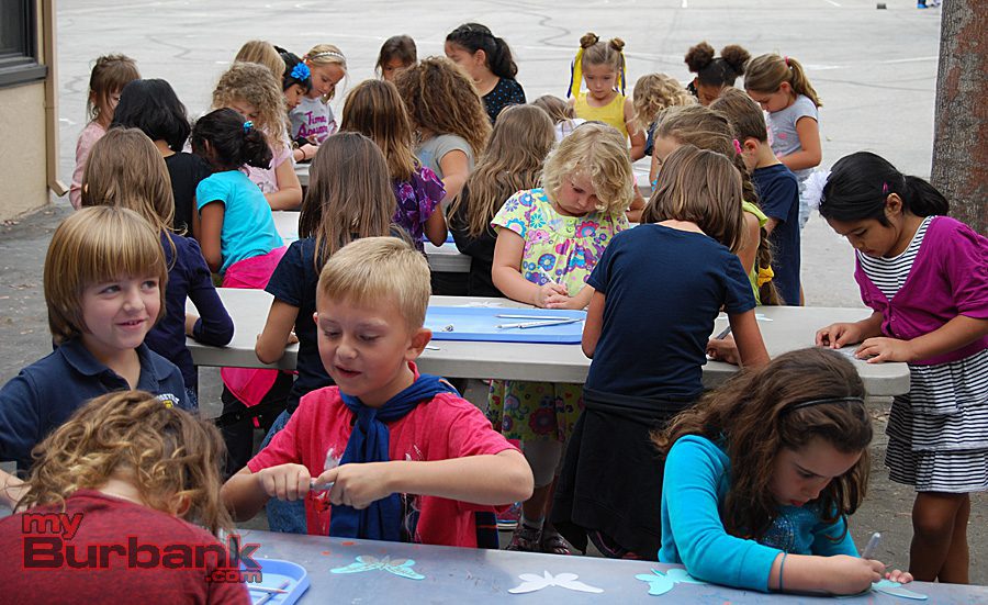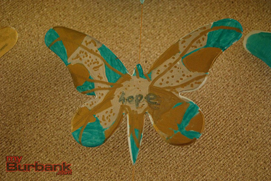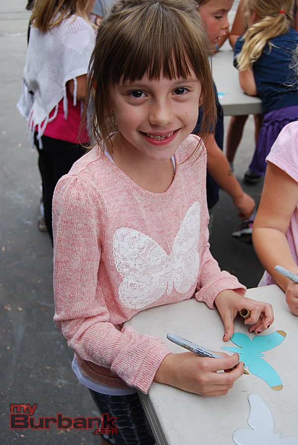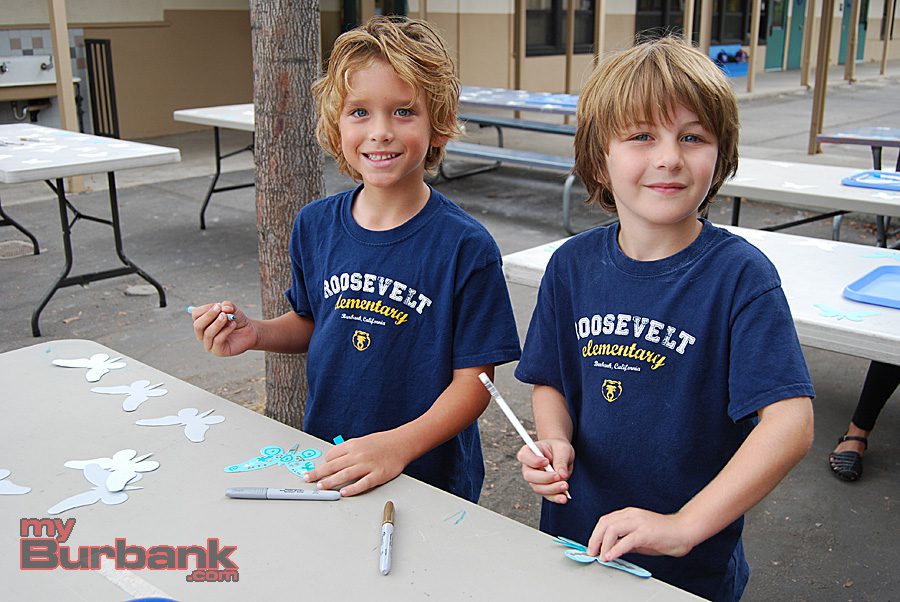 At a lunchtime art project for Cal Arts Day, an annual event sponsored at the school by the Parent Teacher Association (PTA), Roosevelt kids from all grades colored and decorated pre-cut butterflies. PTA Cal Arts Day co-chairs Kristen Gara and Shauna Funk then collected those hundreds of butterflies and used them to create an inspirational display outside the school’s main office.