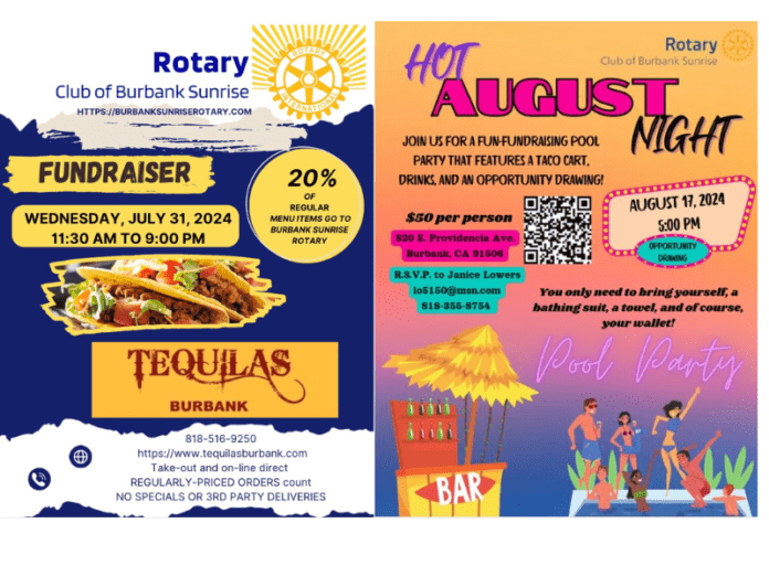 Mark your calendars for August 17th at 5 p.m. and join the Rotary Club of Burbank Sunrise for a lively pool party fundraiser. The event will feature a taco cart, refreshing drinks, and an exciting opportunity drawing. The event is $50 per person and promises to be a night of fun and camaraderie. For more information, contact Janice Lowers at lo5150@msn.com or 818-355-8754.