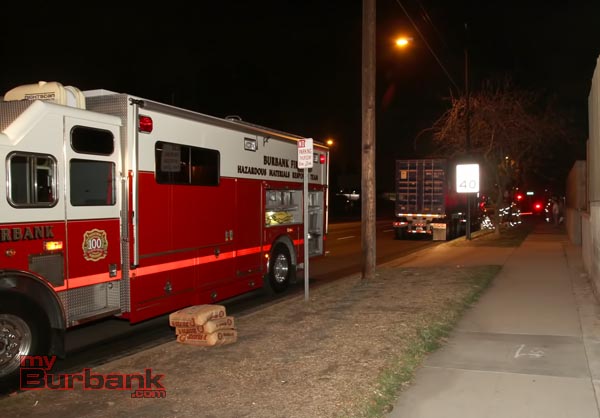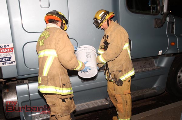 Burbank responded a full Hazmat response to assist with diking and cleanup of some of the fuel that pooled when the truck finally stopped. ( Photo by Ross A. Benson)