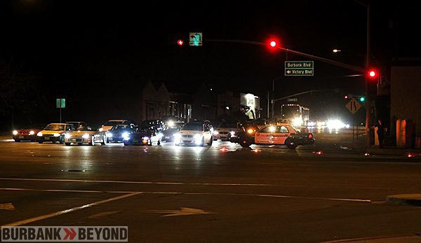 The Burbank Police Department had heard that there was going to be some type of a car show gathering near the Empire Center Tuesday evening, and a kind of “Flash-Mob” of kids and cars is what turned out.