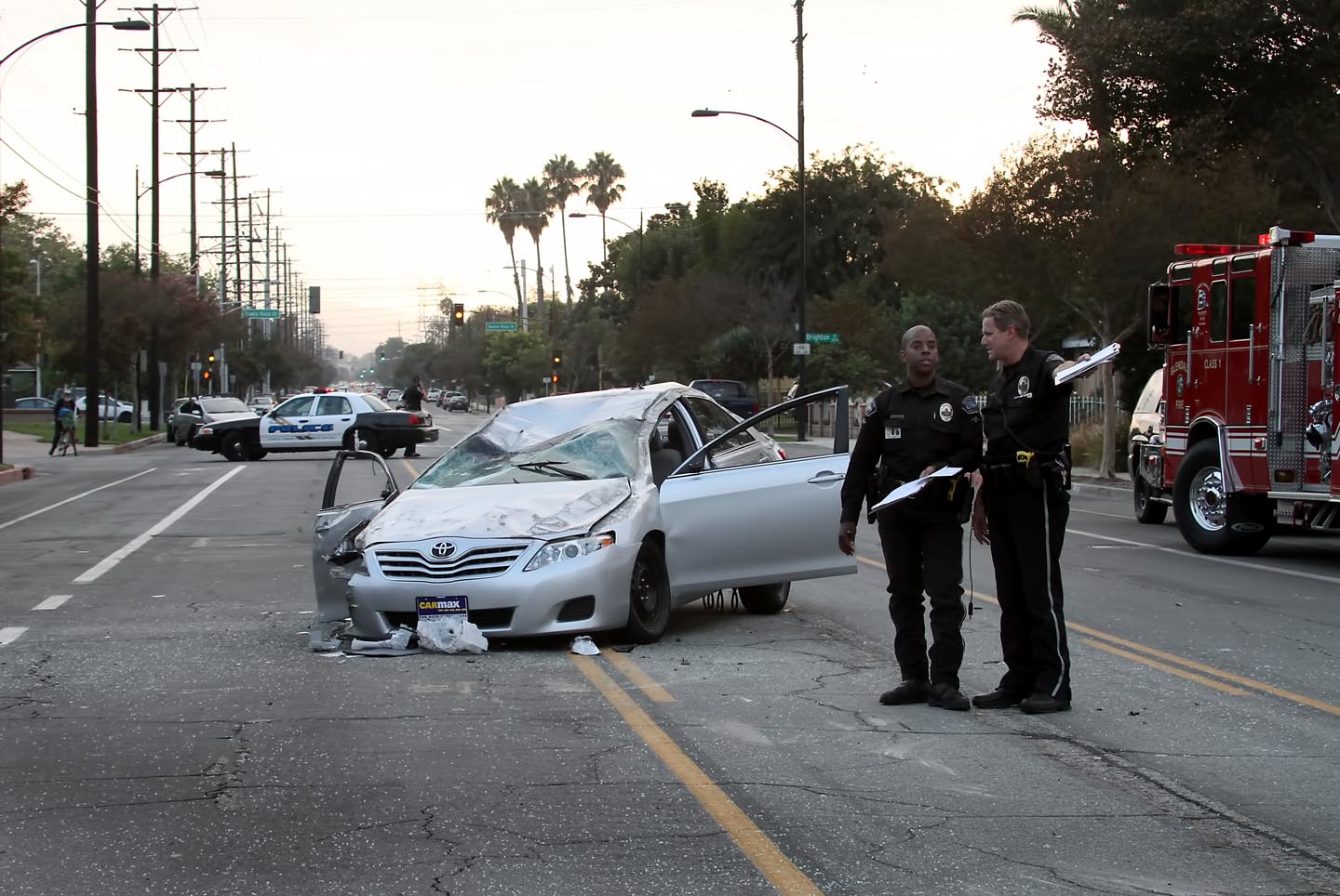 It was reported that the driver of a newer Toyota Camry was west bound Verdugo Avenue at an extremely high rate of speed passing cars in the center of the street, then he struck a parked car, then another and then collided with a car at approximately Lincoln Street. That’s when his car then was catapulted into midair flipping over several times to finally come to rest at approximately mid block on Verdugo west of Lincoln Street.