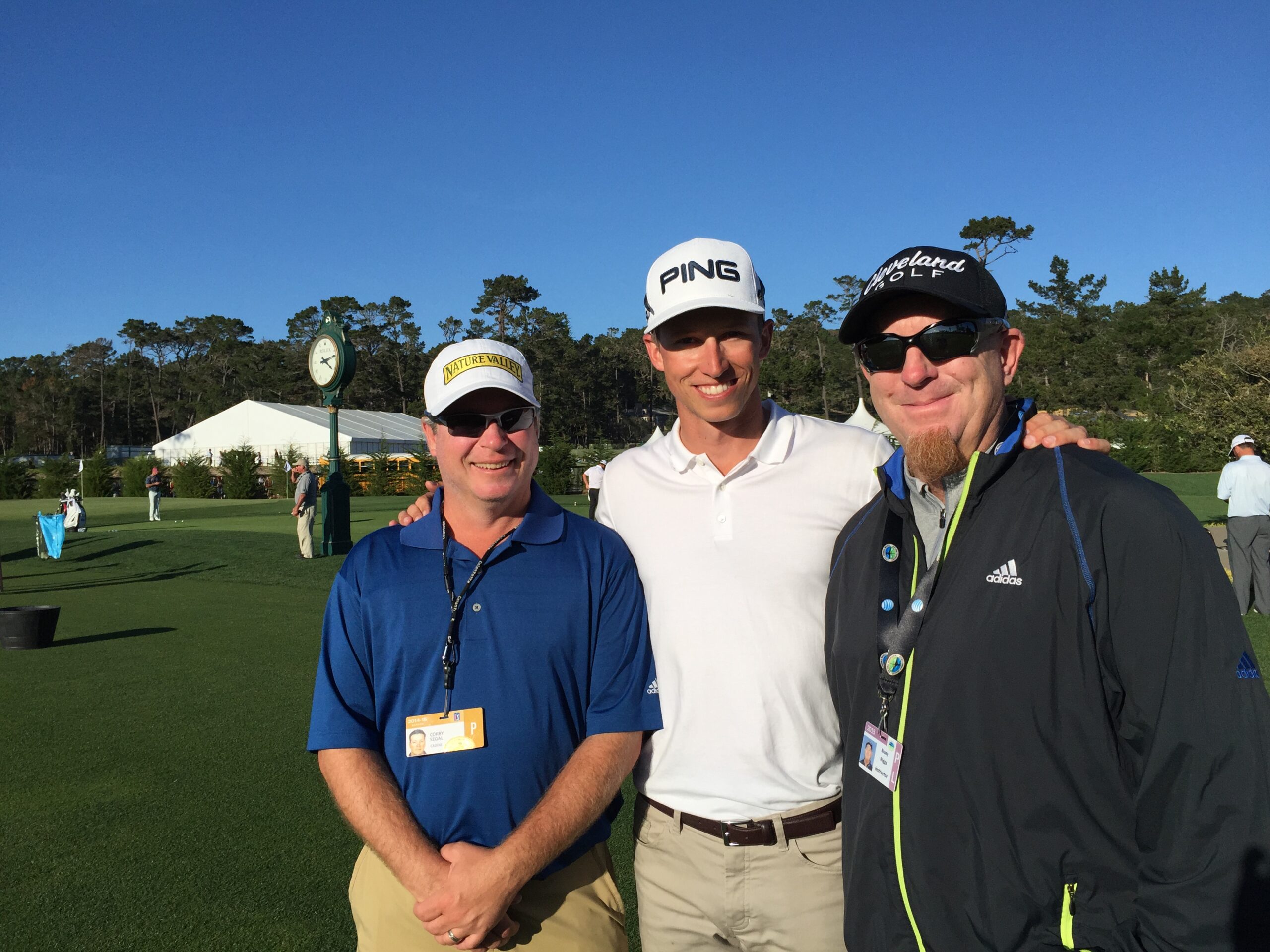 Former Cal Bear All-American Brandon Hagy (center) led the field at the AT&T at Pebble Beach this week in driving distance and tied for 34th after shooting 11-under 276 with rounds of 74, 66, 66, 70. Brandon has been a student of former Burroughs golfer Brady Riggs (right) for the last 11 years and has former Burbank golfer Corby Segal (left) on the bag as his caddy. JBHS and BHS working together….it can happen.