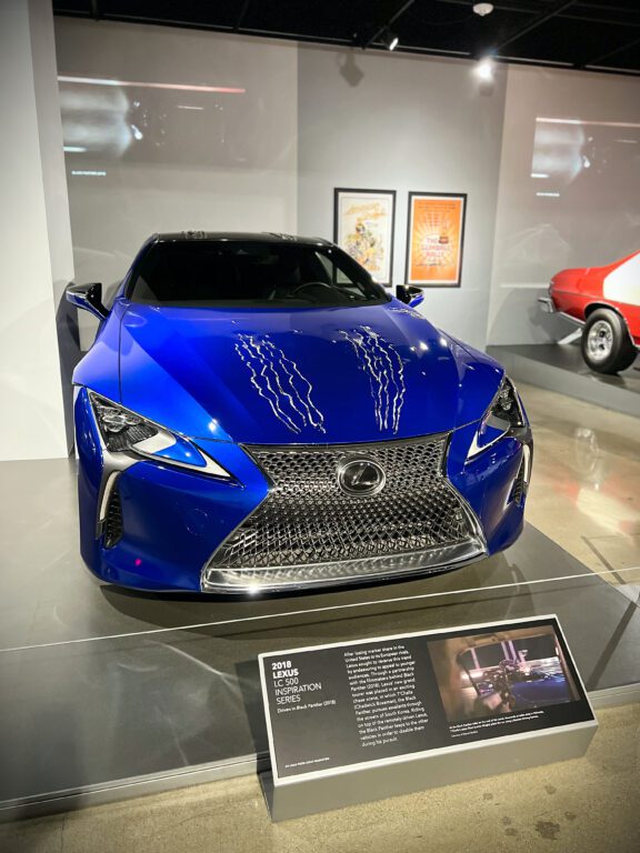 My kids really enjoyed the Cars of Film and Television exhibit where we got to see the sleek 1989 Batmobile from Batman featuring Michael Keaton, and of course classics like Ghostbuster’s Ecto-1 and Back to the Future’s 1981 DMC DeLorean. Their favorite was the 2018 Lexus driven in Marvel’s Black Panther film. The blue LC 500 has the Black Panther’s scratch marks across the hood of the vehicle from the scene when he was pursuing his assailants through South Korea.