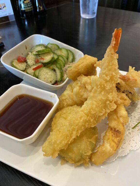We found the extensive menu exciting, with a number of Japanese favorites – both cooked and raw – from which to choose. Small plates like takoyaki, various kinds of tempura, edamame, gyoza, karaage chicken, crispy rice and miso soup whet the appetite.