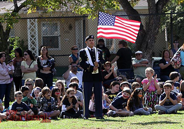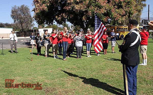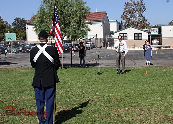 Mayor Dr. David Gordon led the students, teachers and parents in the Pledge of Allegiance as U.S. Army Sergeant First Class Edmundo A. Bendana was flag bearer and color guard. The John Burroughs High School marching band played the national anthem as the entire group of nearly one thousand people sang.