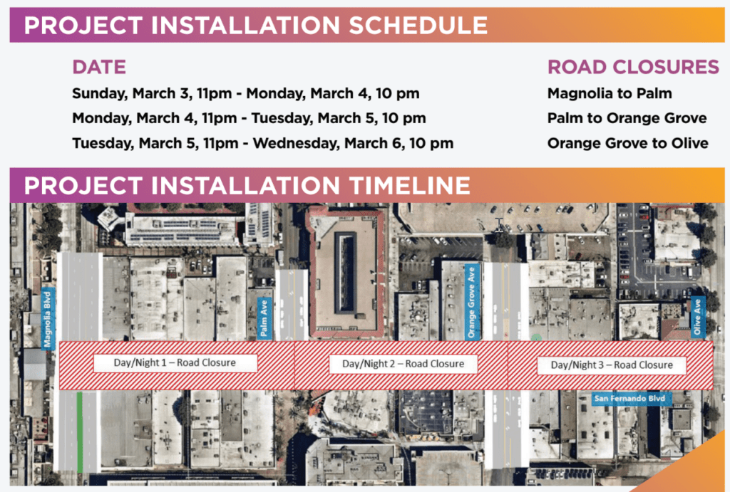 Temporary street closure along San Fernando Boulevard, between Magnolia Boulevard and Olive Avenue, will take place for three days starting March 3, 2024, through March 6, 2024. These closures are for the Downtown Burbank San Fernando Reconfiguration Project which aims to improve the Downtown Burbank area by introducing a one-lane, one-way traffic flow northbound allowing for more streamlined movement and making the Downtown more walkable.