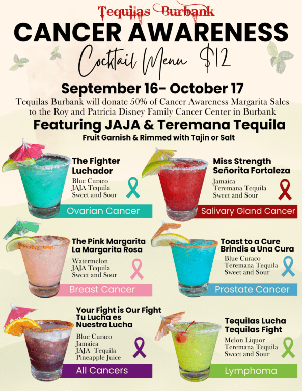 While the event is at capacity, you can put your name on the wait list by texting 818-516-9250. There are many ways that you can still participate in the fundraiser. You can donate directly to the genetics program through the link here, or you can attend Tequilas Burbank anytime between now and October 17 and purchase one of their Cancer Awareness Cocktails. You can also dine in or get takeout any time during business hours on Thursday, October 17th and let your server know before you order that you are there for the fundraiser, and Tequilas Burbank will donate 20% to the cancer center.