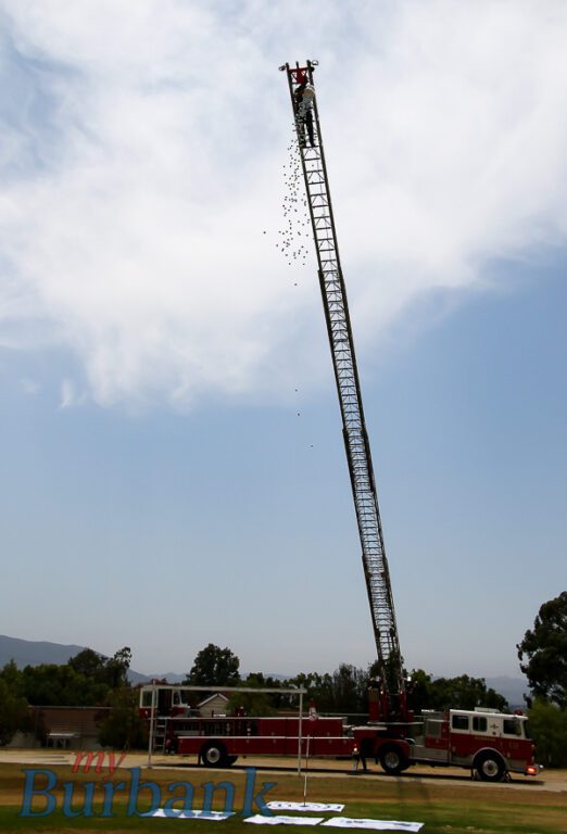 The golf ball drop was led by Burbank Fire Department Battalion Chief Mark Hatch and the crew from Truck 12. The contest consisted of sponsored golf balls being dropped from the top of a BFD truck ladder onto the John Muir Middle School Sports Field.