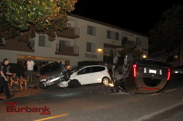 Burbank police checked the driver and passenger for any signs of intoxication and found none. Their investigation at the scene indicated that it appeared the driver may have fallen asleep before he struck the parked cars and overturned. The Burbank Police Traffic Bureau will follow-up the investigation.