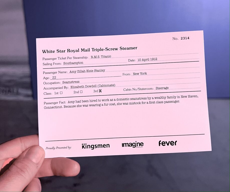 As you begin your journey aboard the RMS Titanic, each guest receives a boarding pass correlating to a real person that boarded in 1912. The boarding pass gives you the person’s name, country of origin, age, occupation, and class. As you trek through the realistic rooms of the ship, you can feel what it was like to be that passenger and at the end of the experience you search for your name on the wall to see if they survived that fateful day.