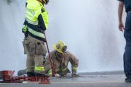 While Burbank Police were doing the investigation part of the accident the Burbank Fire Department had responded for the sheared fire hydrant, once the water flow was stopped they discovered the water had landed on the rooftop of several businesses and the weight of the water caused the roof to collapse. The amount of water that collected inside the Production Studio was nearly 8 inches deep in areas. The Fire Department brought in two truck companies and 2 engine companies to pump, squiggly, and help remove the water.