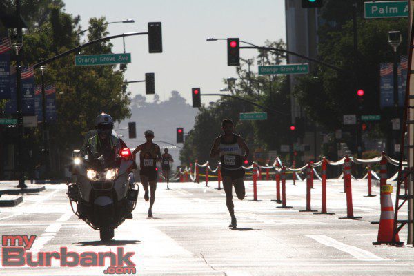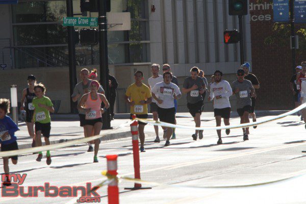 First off were the 5 and 10 K runners led by a Burbank Police Motor Officer as the official pace vehicle. Runners ran up Magnolia Boulevard toward Glenoaks then southbound into the early morning sun. The first runner to come across the finish line was David Torrence with a time of 14:42.