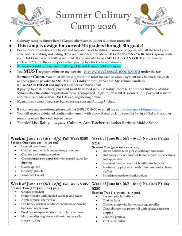 Burbank students who love to cook, or want to learn, will have the opportunity to sharpen their kitchen skills this summer at the My Class Can Cook Summer Culinary Camp 2026, hosted by longtime Luther Burbank Middle School Culinary Arts teacher Lisa Raluy.