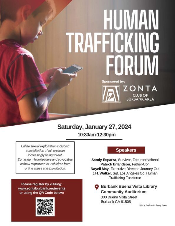 The increasing prevalence of online exploitation, especially of minors, has become a major concern in our society today. To address this alarming issue, the Zonta Club of Burbank Area will be hosting a free Human Trafficking Forum on Saturday, January 27th.